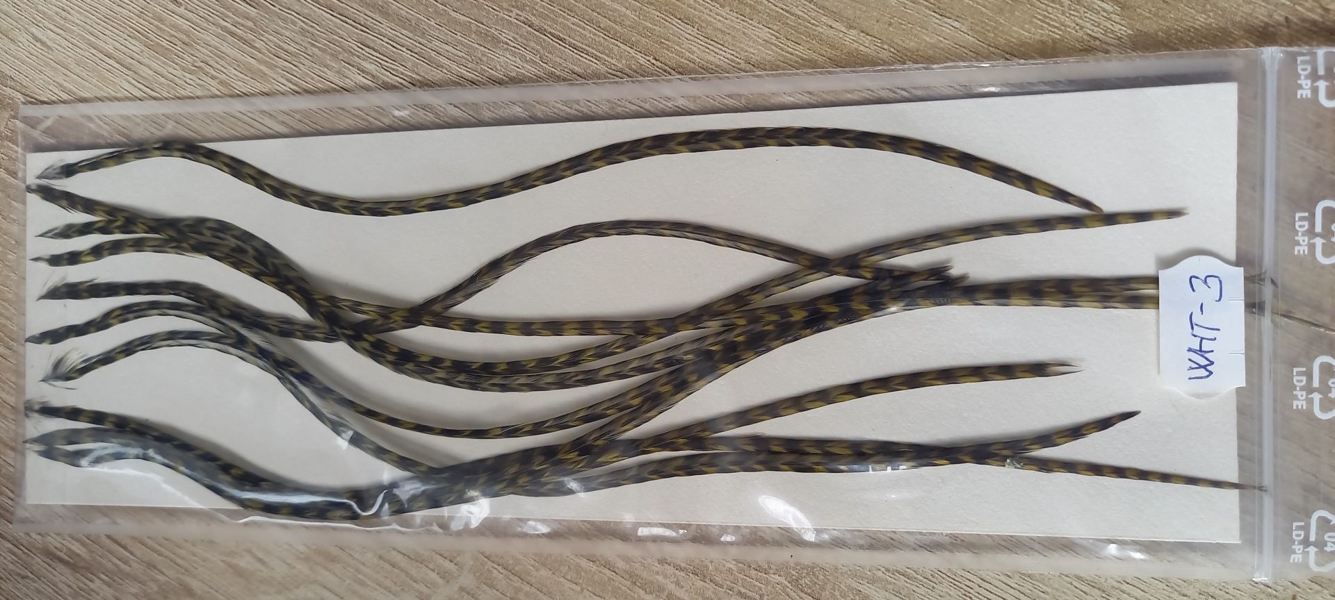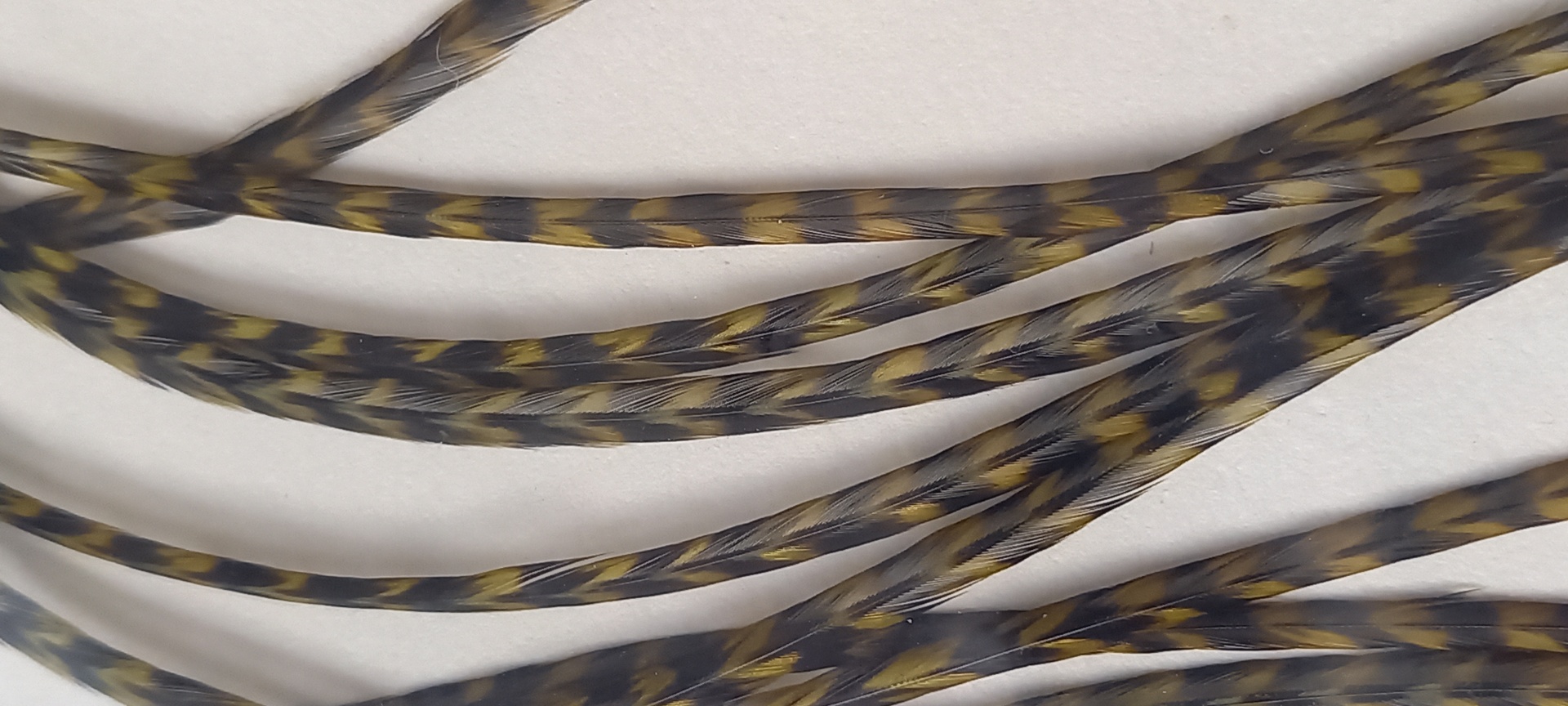 Balení 10 ks srpků Grizzly dyed dark olive (Tmavě olivový barvený grizzly). Hodí se na vázání na háčky vel.12-14. Délka jednotlivých srpků je cca 20cm. Jedná se o barvené grizzly srpky s krásnou strakatou kresbou.