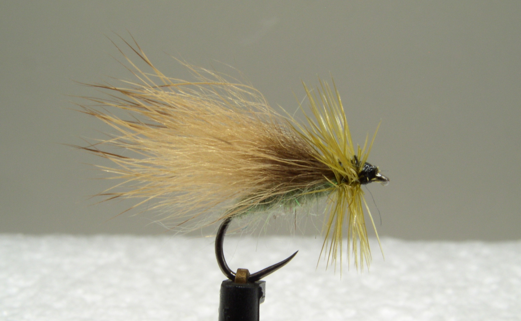Olivový chrostík s křídlem ze sviští srsti. Zajímavý materiál, který výborně plave. A olivoví chrostíci jsou velmi účinné mušky.